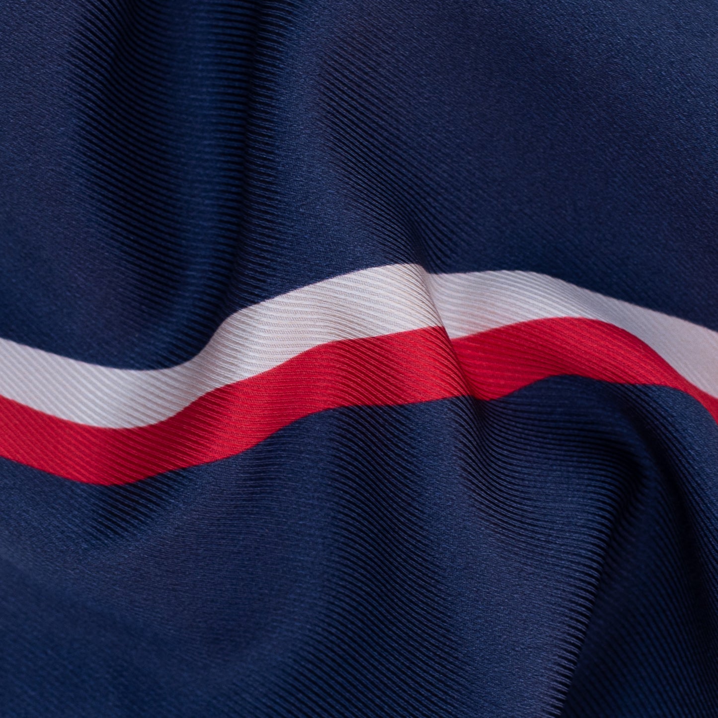 "APOLLO" is to resemble progress in American history. Printed on 40 oz papillon silk. Hand crocheted bar tacks, self tipped, and seven fold. Hand made in Como, Italy, and individually numbered to 21. Measures 3.25" at width and 58'' length. This is a wonderful tie for a formal occasion, or with a dark suit against a white shirt.