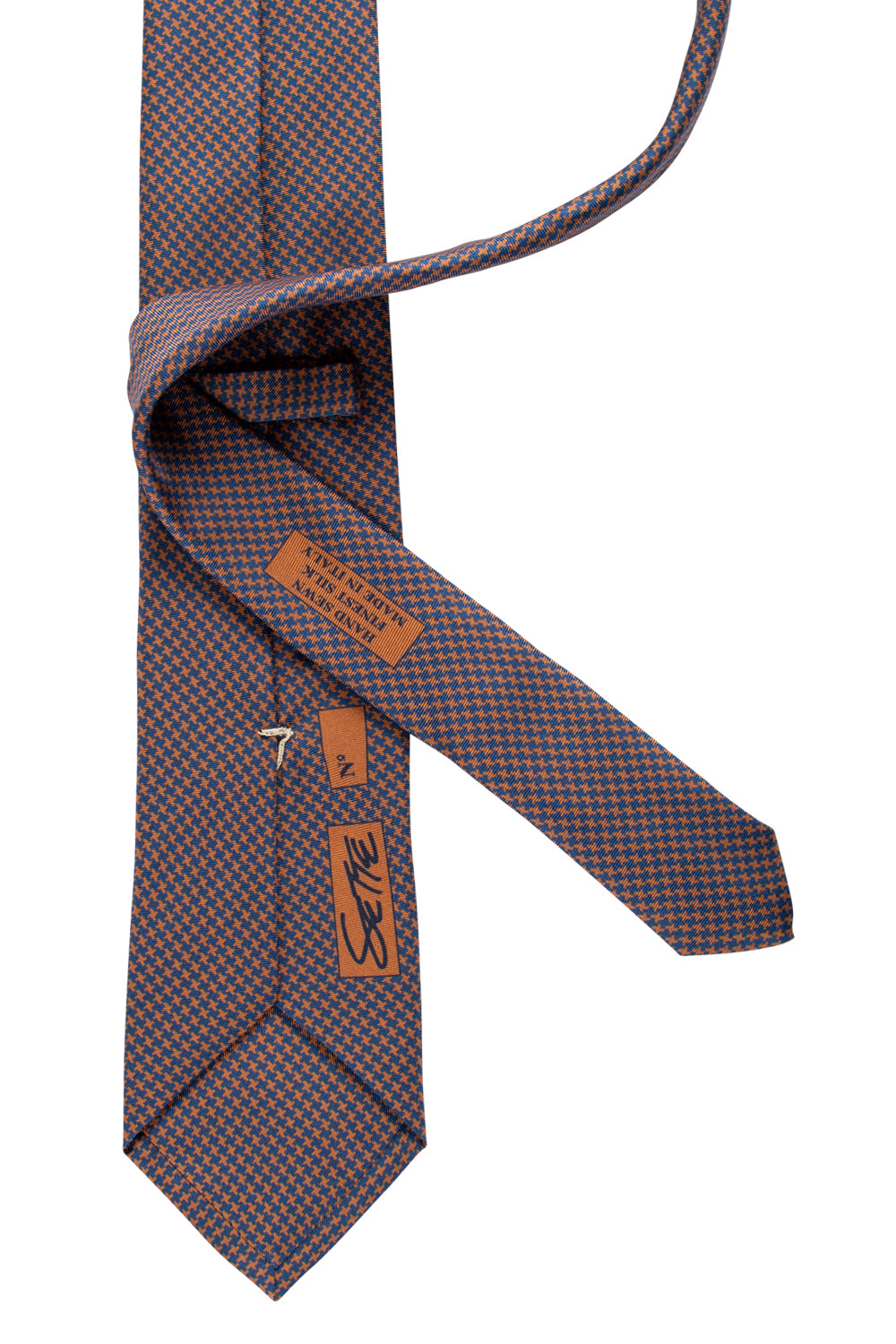”Irvine Houndstooth” is a traditional Navy and copper colored houndstooth pattern printed on a silk wool thread. A beautiful tie. Measurements: 58'' length, 3.25'' width. Self tipped. Self looped. Individually numbered to 21. Crocheted "7" bar tack. Handmade in Como, Italy.
