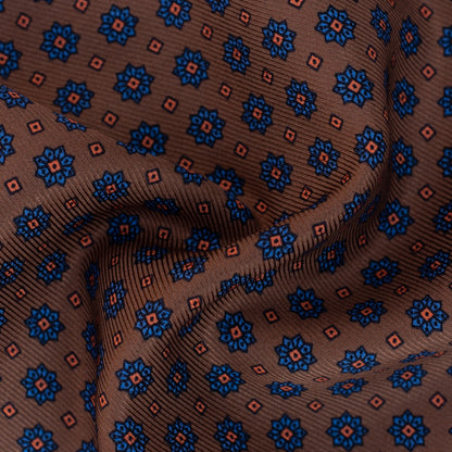 "COWBOY “ is named after a member of the Sette family who was the biggest example of a gentleman, his life he lived as a cowboy in Southern Utah. Royal blue micro medallion shapes set against a Copper colored ground. Measurements: 58'' length, 3.5'' width. Self tipped. Self looped. Numbered to 21. Crocheted "7" bar tack. Handmade in Como, Italy. This tri-fold Sette is printed on AAA Italian silk and perfect for a more frequent wear.
