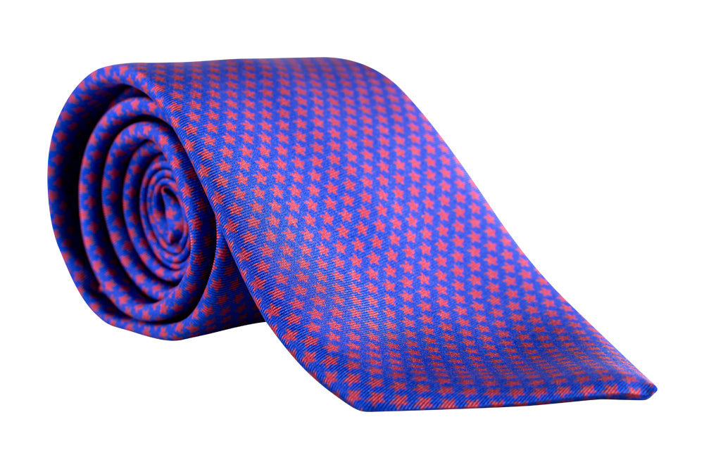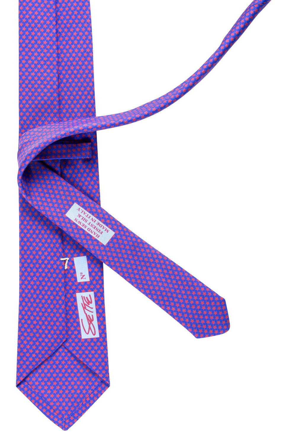 "Royal Red" Royal base colored Red star tie is a classic for any function. printed on 40 oz twill. Measurements: 58'' length, 3.5'' width. Self tipped. Self looped. Numbered to 77. Crocheted "7" bar tack. Handmade in Como, Italy. This tri-fold Sette is printed on AAA Italian silk and perfect for a more frequent wear.